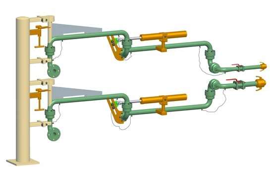 AL2543型汽車底部裝卸臂鶴管,液相配管管線接口向上,氣相配管管線接口向下,用于易揮發(fā)、有毒性的化工介質頂部密閉裝車作業(yè),可實現氣體回收。陸用流體裝卸臂(鶴管)是由轉動靈活、密封性好的旋轉接頭與管道串聯起來,用于槽車與棧橋儲運管線之間,進行液體介質傳輸作業(yè)的設備。